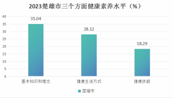 从健康素养的三个方面来看,楚雄市2023年基本知识和理念素养水平为35.04%,健康生活方式与行为素养水平为28.12%,健康技能素养水平为18.29%。