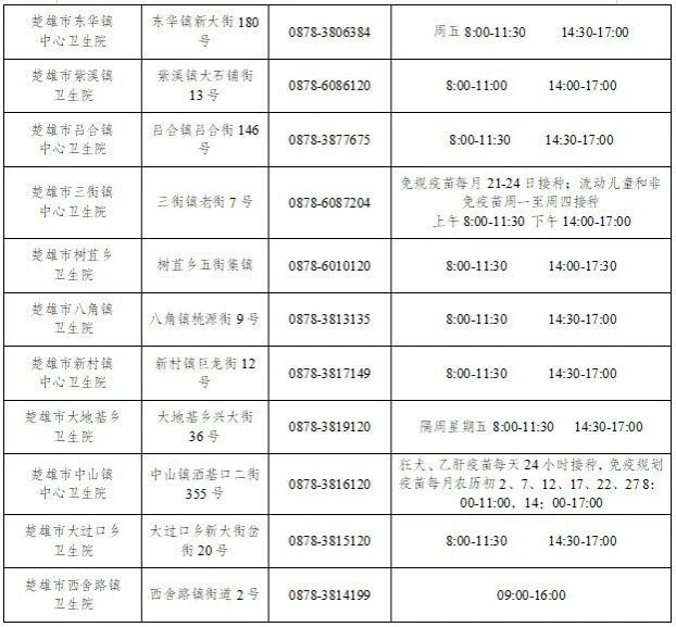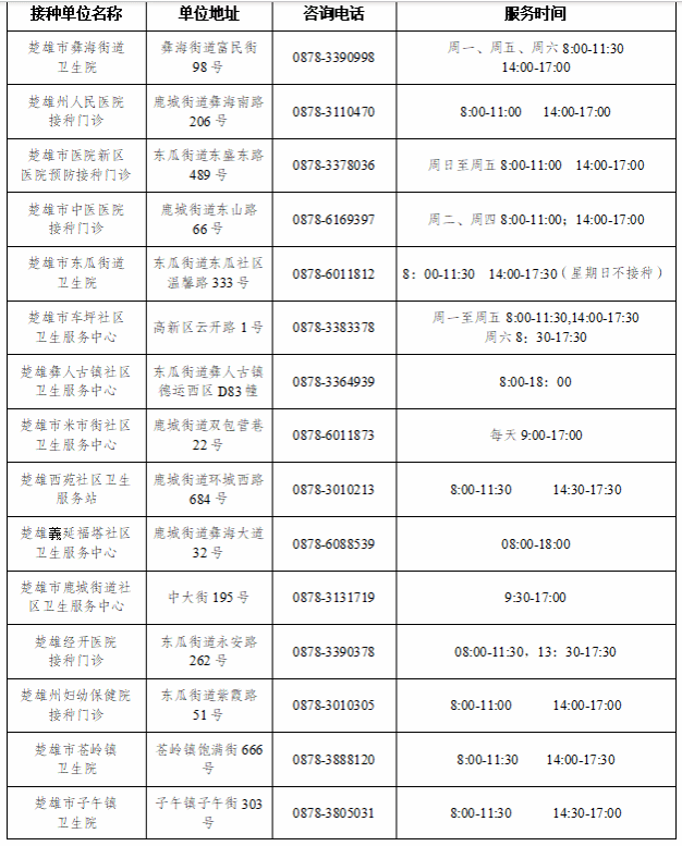 目前,楚雄市辖区内多个接种单位已开通免疫规划HPV疫苗接种服务,各接种点位及咨询电话如下表: