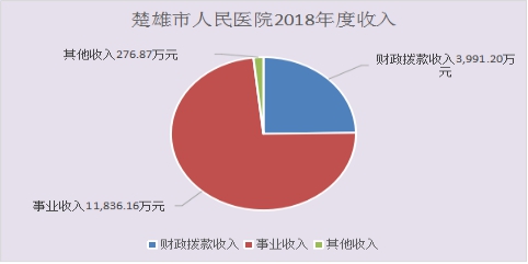 楚雄市人民医院2018年度收入合计16,104.23万元。其中:财政拨款收入3,991.20万元,占总收入的24.78%;上级补助收入0万元,占总收入的0%;事业收入11,836.16万元,占总收入的73.50%;经营收入0万元,占总收入的0%;附属单位缴款收入0万元,占总收入的0%;其他收入276.87万元,占总收入的1.72%。与上年对比增长2,042.98万元,增幅为14.53%。增长的主要原因是:医疗收入增长较快,增幅13.79% ,由于医院在基础设施建设和医疗业务建设方面都有了很大的发展,通过昆明医科大学第一附属医院、昆明医科大学第二附属医院、云南省第二人民医院的专家帮扶,医疗服务水平提高,门诊、住院人次增加。