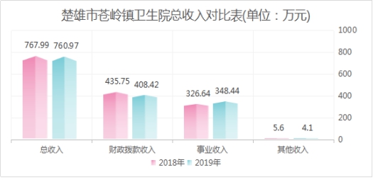 楚雄市苍岭镇卫生院部门2019年度收入合计760.97万元。其中:财政拨款收入408.42万元,占总收入的53.67%;上级补助收入0万元,占总收入的0%;事业收入348.44万元,占总收入的45.79%;经营收入0万元,占总收入的0%;附属单位缴款收入0万元,占总收入的0%;其他收入4.1万元,占总收入的0.54%。与上年对比总收入比上年的767.99万元减少7.02万元,减少0.91%,其中财政拨款收入比上年的435.75减少27.33万元,减少了6.27%,减少的原因为:2019年卫生院经费实行财政一体化资金拨付,2019年度4季度公共卫生经费还未下拨,2019年我院在职人员减少2人,相关的人员经费和公用经费减少。事业收入比上年的326.64万元增加了21.80万元,增加了6.67%, 增加的主要原因为业务能力提升,医保相关扶贫政策实施,门诊和住院就医人员增长,总体上提升事业收入。其他收入比上年的5.60万元减少了1.50万元,减少了26.79%,减少的主要原因为2019年食堂收入减少,利息收入减少。