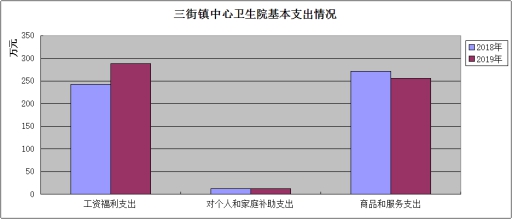 2019年度用于保障楚雄市三街镇中心卫生院机关、下属事业单位等机构正常运转的日常支出559.87万元。其中工资福利支出为288.2万元(其中基本工资67.98万元、津贴补贴56.43万元、绩效工资94.6万元、养老保险缴费27.97万元、职业年金1.31万元、职工基本医疗保险15.21万元、公务员医疗补助7.98万元、其他社会保障缴费1.64万元、住房公积金15.08万元),与上年工资福利支出243.23万元,本年度增加了44.97万元,增加了18.49%,增加主要原因为2019年度人员增加,工资及社保费增加;对个人和家庭补助支出13.11万元,为退休费,与上年的13.04万元,增加了0.07万元,增加了0.5%,增加的主要原因为正常增资;商品和服务支出为255.61万元,与上年的271.74万元,减少了16.13万元,减少了5.93%,减少的主要原因为节俭支出。包括基本工资、津贴补贴等人员经费支出占基本支出的53.82%;办公费、印刷费、水电费、办公设备购置等日常公经费占基本支出的46.18%。