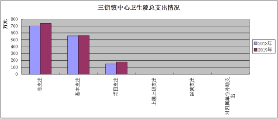 楚雄市三街镇中心卫生院部门2019年度支出合计740.04万元。其中:基本支出559.87万元,占总支出的75.65%;项目支出180.17万元,占总支出的24.35%;上缴上级支出、经营支出、对附属单位补助支出共0万元,占总支出的0%。与上年对分析:2019年基本支出比上年增加了3.62万元,增加了0.65%,主要增加原因为人员经费增加;项目支出比上年增加了31.67万元,增加了21.32%,增加原因主要为基本公共卫生项目经费支出增加及特岗医生项目资金支出增加;总支出比上年增加了35.29万元,增加了5%,增加的主要原因为项目资金支出增加。