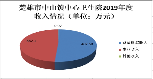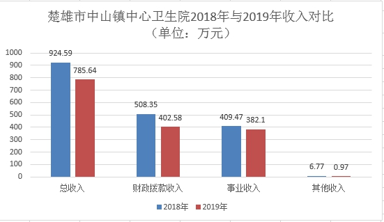 楚雄市中山镇中心卫生院部门2019年度收入合计785.64万元。其中:财政拨款收入402.58万元,占总收入的51.24%;上级补助收入0万元,占总收入的0%;事业收入382.1万元,占总收入的48.63%;经营收入0万元,占总收入的0%;附属单位缴款收入0万元,占总收入的0%;其他收入0.97万元,占总收入的0.12%。与上年对比总收入比上年的924.59万元减少138.95万元,下降15.03%,其中财政拨款收入比上年的508.35万元减少105.77万元,下降了20.81%,下降的主要原因为2018年财政拨款收入含70万元急救站专项设备购置资金,公共卫生专项资金减少37.74万元。事业收入比上年的409.47万元减少了27.37万元,下降了6.68%,下降的主要原因为本年度外派进修人员14人次,导致在岗人员匮乏,开展业务能力下降;其次是由于公共卫生服务、家庭医生签约工作的进一步落实,整体提高居民健康水平。其他收入比上年的6.77万元减少了5.8万元,减少85.67%,因为2019年其他收入多为偿还历史药品款让利款项,2020年无类款项较少。