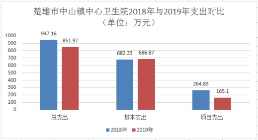 楚雄市中山镇中心卫生院部门2019年度支出合计851.97万元。其中:基本支出686.87万元,占总支出的80.62%;项目支出165.1万元,占总支出的19.38%;上缴上级支出、经营支出、对附属单位补助支出共0万元,占总支出的0%。与上年对比总支出比上年的947.16万元减少了95.19万元,下降了10.05%,其中,基本支出比上年的682.33万元减少了4.54万元,下降了0.67%,减少的主要原因是2019年11-12月公积金暂未下达支付。项目支出比上年的264.83万元减少了99.73万元,下降了37.66%,下降的主要原因是2019年支出山区急救站项目资金70万元,本年度公共卫生资金减少支出30.23万元。