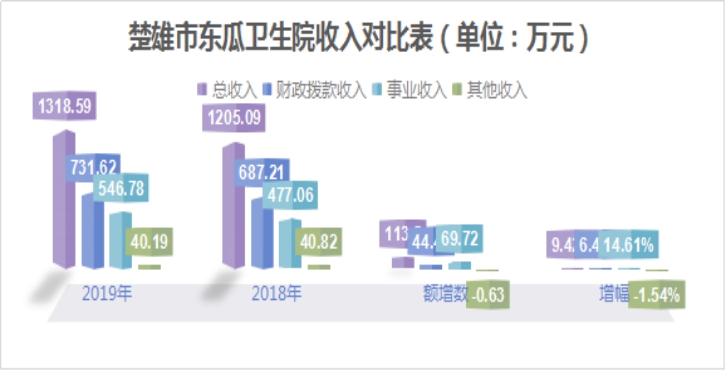 2019年度收入1,318.59万元与2018年度收入1,205.09万元相比,增加了113.5万元,增长9.42%。2019年财政拨款收入731.62万元,比2018年的687.21万元,增加了44.41万元,增长6.46%,主要原因是:拨入2019年未拨部分中央、省州公共卫生资金。2019年事业收入546.78万元,比2018年的477.06万元,增加了69.72万元,增长14.61%,主要原因是:2019年东瓜镇卫生院门诊人次、住院人次增加,加之,服务质量不断提升,导致卫生院收入增加;其他收入40.19万元,比2018年的40.82万元,减少了0.63万元,减少1.54%,主要原因是:利息收入减少,食堂收入减少等因素,导致其他收入减少。