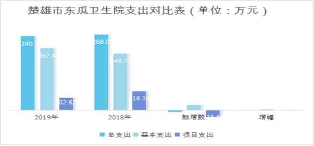 楚雄市东瓜镇卫生院部门2019年度支出合计1,240.3万元,比2018年1268.07万元减少27.77万元,下降2.19%,主要原因是:2019年部分中央、省州公共卫生资金未拨。其中:基本支出1,037.48万元,占总支出的83.65%,比2018年949.73万元,增加87.75万元,增长9.24%,主要原因是增加机关事业单位职业年金缴费支出、2018年第四季度公共卫生资金支出等。项目支出202.82万元,占总支出的16.35%,比2018年318.33万元减少115.51万元,下降36.29%。主要原因是:公共卫生资金支出减少,导致项目支出比2018年下降。