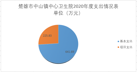 楚雄市中山镇中心卫生院部门2020年度支出合计867.52万元。其中:基本支出641.69万元,占总支出的73.97%;项目支出225.83万元,占总支出的26.03%;上缴上级支出、经营支出、对附属单位补助支出共0万元,占总支出的0%。与上年对比总支出比上年的851.97万元增加了15.55万元,增长了1.83%,其中,基本支出比上年的686.87万元减少了45.18万元,下降了6.58%,减少的主要原因2020年我院事业收入减少,故相关的药品支出减少;2020年基本养老保险缴费比例下降,相应的缴费支出减少。项目支出比上年的165.1万元增加了60.73万元,增长了36.78%,增长的主要原因是2020年度公共卫生资金比上年度增加支出18.48万元,增加重大公共卫生哨点诊室项目资金15.1万元,信息化建设项目资金17.80万元,2019年结转特岗人员补助助资金12.53万元。