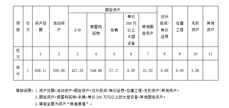 截至2020年12月31日,楚雄市中山镇中心卫生院部门资产总额636.11元,其中,流动资产205.00元,固定资产427.25元,对外投资及有价证券0万元,在建工程0元,无形资产3.86元,其他资产0元(具体内容详见附表)。与上年相比,本年资产总额减少22.98万元,其中固定资产减少21.92万元。处置房屋建筑物0平方米,账面原值0万元;处置车辆0辆,账面原值0万元;报废报损资产0项,账面原值0万元,实现资产处置收入0万元;出租房屋0平方米,账面原值0万元,实现资产使用收入0万元。