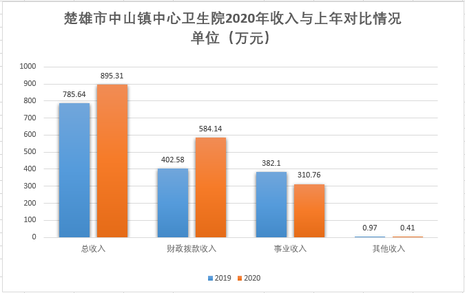 楚雄市中山镇中心卫生院部门2020年度收入合计895.31万元。其中:财政拨款收入584.14万元,占总收入的65.24%;上级补助收入0万元,占总收入的0%;事业收入310.76万元,占总收入的34.71%;经营收入0万元,占总收入的0%;附属单位缴款收入0万元,占总收入的0%;其他收入0.41万元,占总收入的0.05%。与上年对比,总收入比上年的785.64万元增长109.67万元,增长13.96%,其中财政拨款收入比上年的402.58万元增长了181.57万元,增长了45.10%。事业收入比上年的382.10万元减少了71.33万元,下降了18.67%,其他收入比上年的0.97万元减少了0.56万元,减少57.73%。本年度总收入与上年相比增加的原因主要为财补收入增加,基本公共卫生项目拨款213.62万元,重大公共卫生拨款15.1万元;信息化建设项目补助收入为17.80万元。事业收入减少的主要原因为2020年的我院专业技术人才流失,特别是中医适宜技术水平下降,导致就医患者减少,编办发文编外人员限额,我单位解聘部分临聘人员,以及协议规培人员3人,导致单位人员不足,就医体验差,流失部分患者。外环境原因是疫情过后经济复苏,外出务工人员增多,本地就医人员减少。