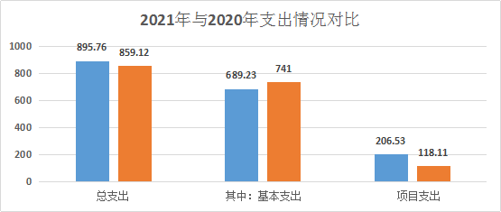 与上年对比2020年度支出合计895.76万元,2021年度支出合计859.12万元,增加207.62万元,与上年对比总支出增加30.17%。2020年度基本支出689.23万元,2021年度基本支出741.00万元,比上年增加34.22万元,增加7.51%。增加的主要原因业务量增加,相应运行成本支出增加。2020年度项目支出206.53万元,2021年度项目支出118.11万元,比上年减少88.42万元,减少42.81%。财政补助收入比上年减少的主要原因为:2021年基本公共卫生服务项目资金财政拨款减少。