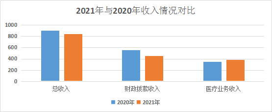 2020年度年度收入合计899.86万元,2021年度收入合计847.38万元,减少52.48万元,同比减少5.83%。本年度总收入与上年相比减少的原因主要为财政拨款收入减少。其中:财政拨款453.89万元,比上年552.74万元,减少98.85万元,减少17.88%;财政补助收入比上年减少的主要原因为:2021年基本公共卫生服务项目资金财政拨款减少。事业收入381.13万元,比上年346.91万元,增加34.22万元,增加9.86%。增加的主要原因业务量增加。