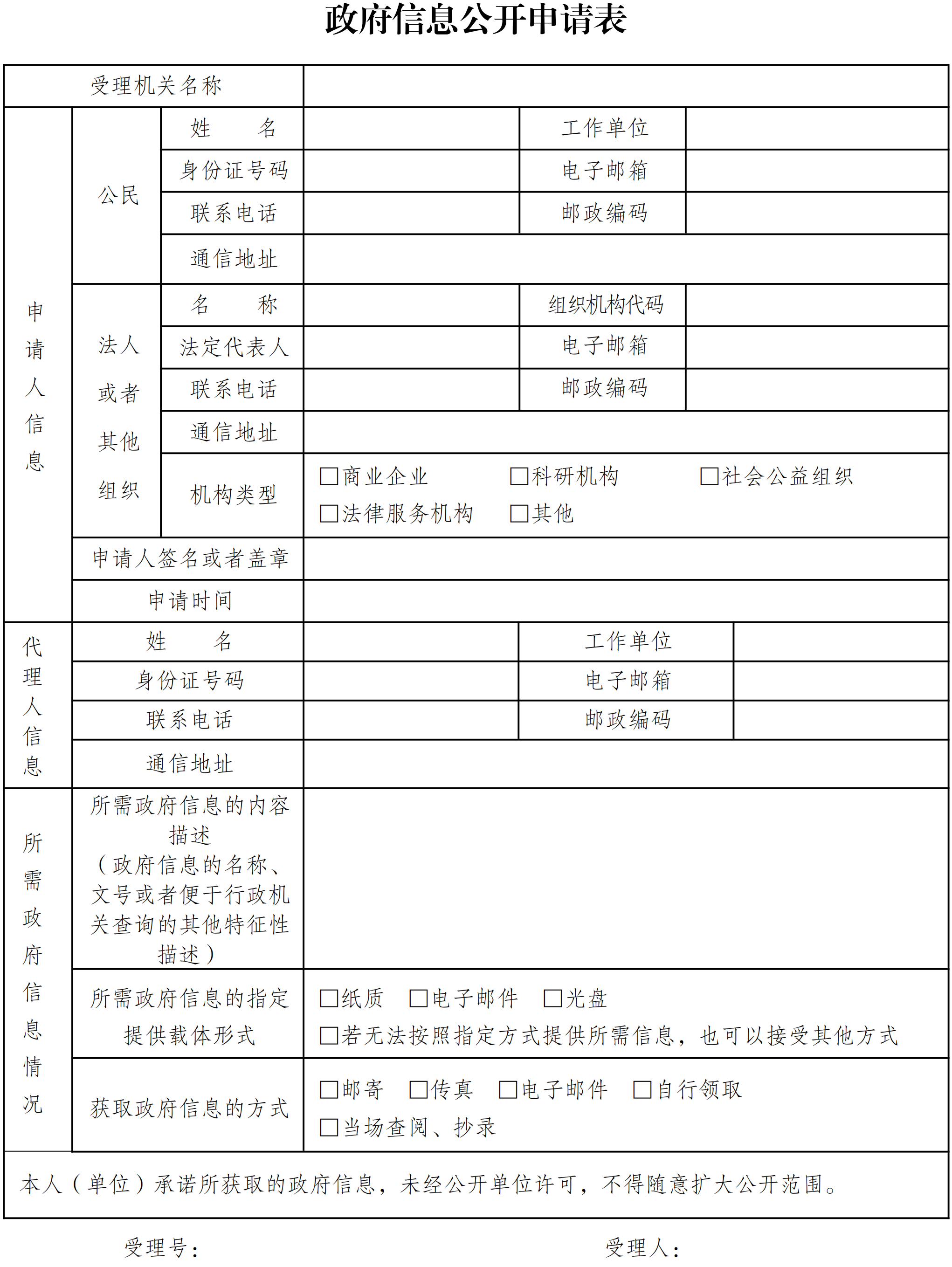 申请人填写《政府信息公开申请表》(以下简称申请表),申请人对所需信息的描述需详细、准确,尽量采取便于本机关查询的名称、文号或者其他特征性描述。申请表可以到楚雄市人民政府办公室政务公开与政务信息中心领取,也可以在楚雄市人民政府网站政府信息公开指南下载(本页面底部附件1),申请表复印有效。